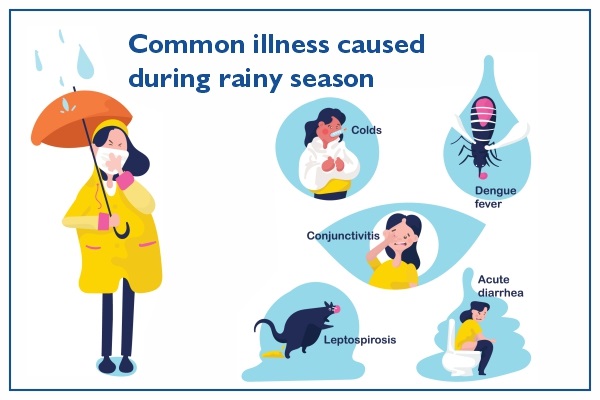 Common cold is another common disease in the rainy season and it is due to the virus that grows in the moist and sultry conditions during this season. Being in wet clothes for long time and also getting wet successively cause the risk of cough, cold, fever and fungal infection.