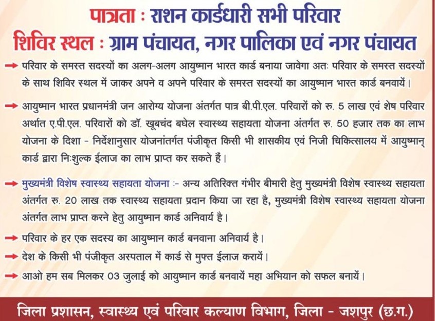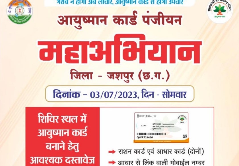 जशपुरनगर : जिला प्रशासन एवं स्वास्थ्य एवं परिवार कल्याण विभाग के द्वारा आयुष्मान कार्ड पंजीयन महाअभियान 03 जुलाई 2023 को जिले के सभी विकासखंड के ग्राम पंचायत, नगर पालिका एवं नगर पंचायत में आयोजित किया जा रहा है।