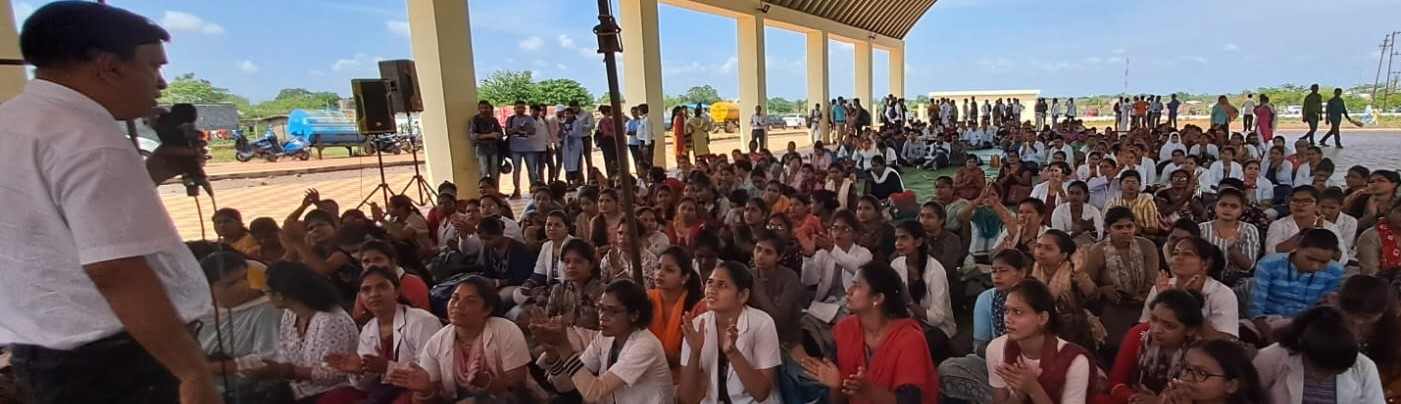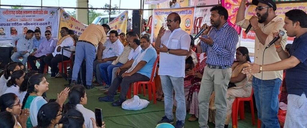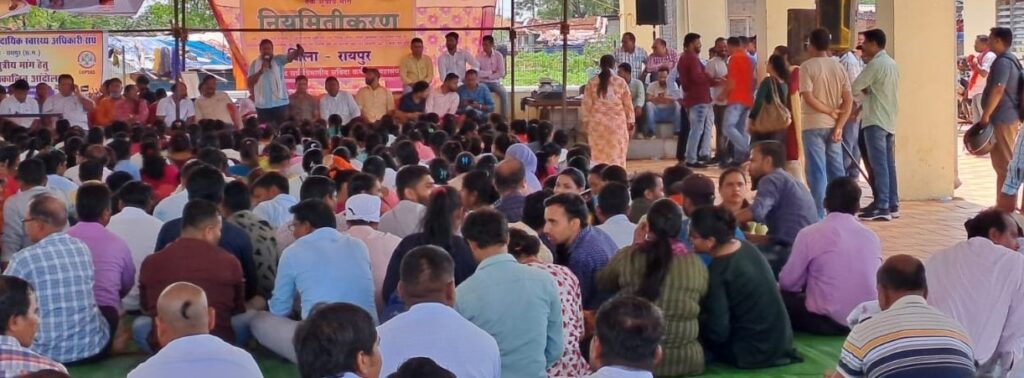 Round about 1000 employees led by the CPSKS state level office bearers including Patron OP Sharma, State President Alok Mishra, Working President Pradeep Bogie, General Secretary Ashwini Gurdekar, Employees-Officers Federation Convenor Anil Shukla, Vice President SP Dewangan, Raipur District President SS Soni and several other office bearers of the association assembled at Tuta, Naya Raipur, where during the dharna that continued from 11 am to 3 pm the office bearers addressed the employees and encouraged them to raise their voice for fulfilment of the 24-point demands, which when fulfilled would make the health services better for the common people of the state.