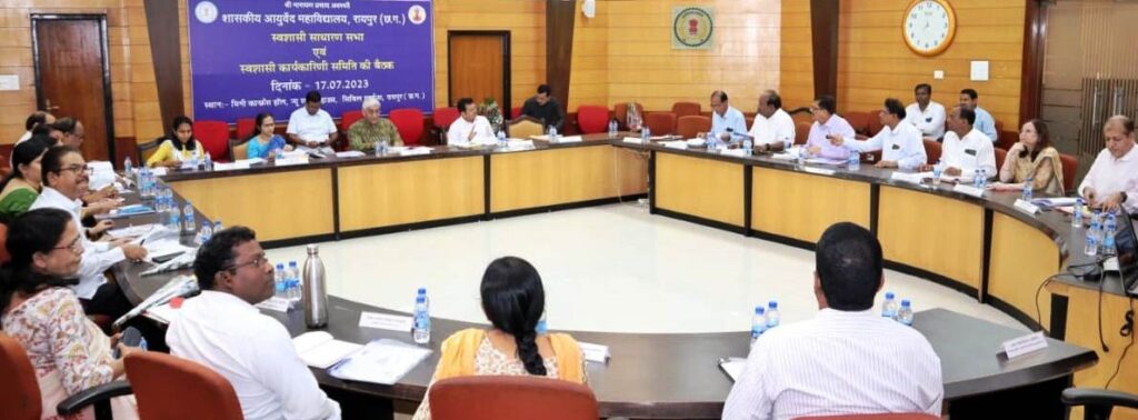 शासकीय आयुर्वेद महाविद्यालय रायपुर और बिलासपुर की स्वशासी साधारण सभा एवं कार्यकारणी समिति की बैठक में रायपुर के महापौर श्री एजाज ढेबर, चिकित्सा शिक्षा विभाग की अपर मुख्य सचिव श्रीमती रेणु जी. पिल्लै, चिकित्सा शिक्षा विभाग के सचिव श्री पी. दयानंद, आयुष विभाग की संचालक सुश्री नम्रता गांधी, रायपुर संभाग के आयुक्त डॉ. संजय अलंग, बिलासपुर संभाग के आयुक्त श्री भीम सिंह, आयुष विभाग के संयुक्त संचालक डॉ. सुनील दास, शासकीय आयुर्वेद महाविद्यालय रायपुर के प्राचार्य डॉ. जी.आर. चतुर्वेदी, रजिस्ट्रार डॉ. संजय शुक्ला और शासकीय आयुर्वेद महाविद्यालय बिलासपुर के प्राचार्य डॉ. आर.पी. गुप्ता सहित दोनों समितियों के सदस्य एवं विभागीय अधिकारी मौजूद थे।