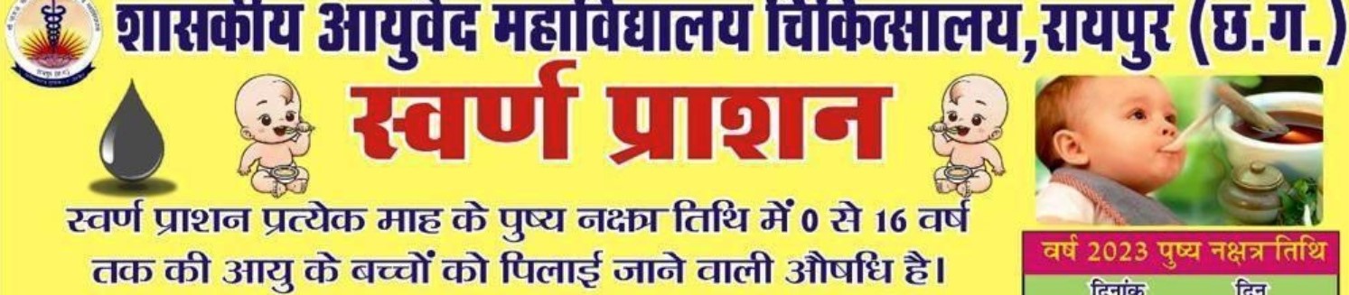 शासकीय आयुर्वेद महाविद्यालय चिकित्सालय में हर पुष्य नक्षत्र तिथि में बच्चों के लिए स्वर्ण प्राशन का आयोजन किया जाता है। इस वर्ष की आगामी पुष्य नक्षत्र तिथियों 14 अगस्त, 10 सितम्बर, 7 अक्टूबर, 4 नवम्बर, 1 दिसम्बर और 29 दिसम्बर को बच्चों को स्वर्ण प्राशन कराया जाएगा।