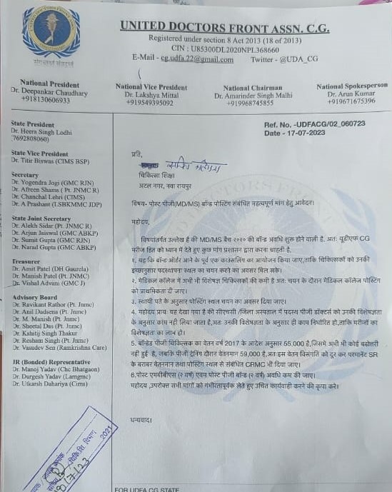 1. यह कि बॉन्ड ऑर्डर आने के पूर्व एक काउंसलिंग का आयोजन किया जाए,ताकि चिकित्सकों को उनकी इच्छानुसार पदस्थापना स्थल का चयन करने का अवसर मिल सके।