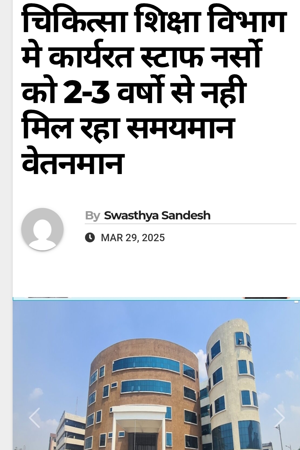 श्री एस.पी. देवांगन महामंत्री ने जानकारी दी है कि दिनांक 29.03.2025 को ओ.पी.शर्मा संरक्षक/सलाहकार, छ.ग.प्रदेश स्वास्थ्य कर्मचारी संघ के नेतृत्व मे सचिव, छ.ग. शासन, लोक स्वास्थ्य एवं परिवार कल्याण एवं चिकित्सा शिक्षा विभाग, आयुक्त, चिकित्सा शिक्षा विभाग एवं संचालक चिकित्सा शिक्षा विभाग से भेटकर चिकित्सा शिक्षा विभाग मे कार्यरत स्टाफ नर्स एवं नर्सिंग सिस्टर को समयमान वेतनमान मिलने मे हो रही विंलब को कारण सहित प्रस्तुत कर स्टाफ नर्स का अधिष्टाता, संयुक्त संचालक स्तर पर समयमान प्रदाय करने एवं नर्सिंग सिस्टर का संचालक स्तर पर अविंलब समयमान प्रदाय करने हेतु निवेदन किया गया था। जिसमे सकारात्मक कार्यावाही करते हुए स्टाफ नर्सो का अधिष्ठाता, संयुक्त संचालक स्तर से समयमान वेतनमान प्रदाय करने हेतु स्पष्ट निर्देश जारी किया गया है । एवं नर्सिंग सिस्टरो , सहायक नर्सिंग अधीक्षक का संचालक स्तर से समयमान प्रदाय करने का आदेश जारी किया है ,जिसके लिए संघ ने सचिव महोदय, आयुक्त महोदया एवं संचालक चिकित्सा शिक्षा के प्रति अभार प्रकट करते हुए धन्यवाद ज्ञापित किया गया है।