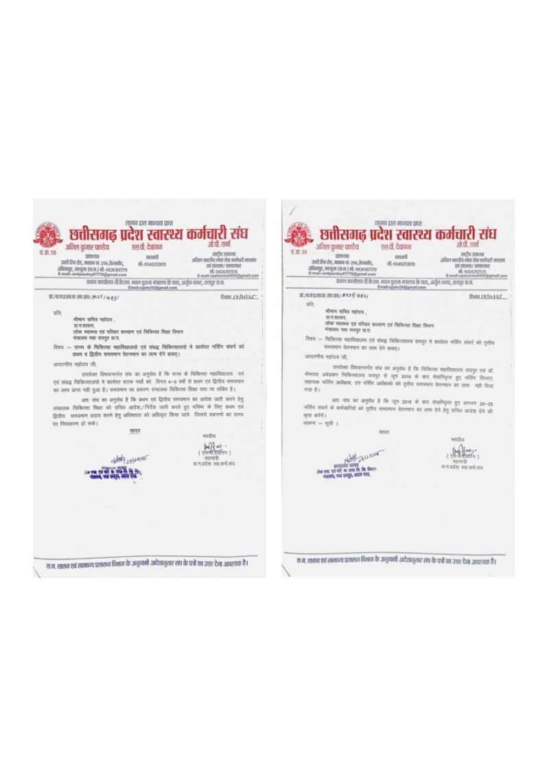 दिनंाक 17.12.2025 को छ.ग. प्रदेश स्वास्थ्य कर्मचारी संघ के प्रांताध्यक्ष अनिल कुमार पाण्डेय, राष्ट्रीय उपाध्यक्ष एव संरक्षक सलाहकार ओ. पी.शर्मा के निर्देशानुसार संघ प्रतिनिधी मंडल एस.पी.देवांगन महामंत्री के नेतृत्व मे माननीय श्री अमित कटारिया, सचिव, छ.ग.शासन लोक स्वास्थ्य एवं परिवार कल्याण व चिकित्सा शिक्षा से भेटकर बताया गया कि चिकित्सा शिक्षा विभाग मे कार्यरत नर्सिंग संवर्ग,नर्सिंग सिस्टर, सहायक नर्सिंग अधीक्षक, उप नर्सिंग अधिक्षक,स्टाफ नर्स को विगत 4-5 वर्ष से प्रथम, द्वितीय एवं तृतीय समयामान का लाभ नही दिया गया है, कई नर्सिंग संवर्ग के कर्मचारी सेवानिवृत्त हो गये है एवं कई सेवानिवृत्त होने वाले है, जिसमे माननीय सचिव महोदय द्वारा कार्यवाही का प्रक्रियाधीन बताया गया है एवं शीघ्र लंबित समयमान प्रकरणो का निराकरण करने हेतु आशन्वित किया गया ।