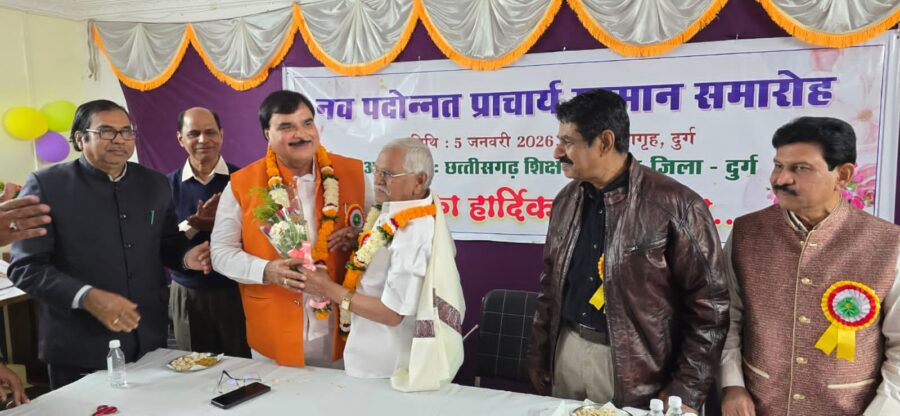 छत्तीसगढ़ शिक्षक कांग्रेस जिला दुर्ग द्वारा जिले में पदस्थ नव पदोन्नत प्राचार्यों का सम्मान समारोह 5 जनवरी को संयुक्त संचालक शिक्षा संभाग दुर्ग के मंथन सभागृह में डोमन लाल कोर्सेवाडा विधायक अहिवारा एवं उपाध्यक्ष कैबिनेट मंत्री दर्जा छत्तीसगढ़ अनुसूचित जाति विकास प्राधिकरण के मुख्य आतिथ्य तथा अनिल शुक्ला प्रांताध्यक्ष छत्तीसगढ़ शिक्षक कांग्रेस एवं प्रांतीय संयोजक छत्तीसगढ़ प्रिंसिपल्स एसोसिएशन की अध्यक्षता में आयोजित किया गया।कार्यक्रम में संयुक्त संचालक शिक्षा आर एल ठाकुर,सीमा नायक सहायक संचालक दुर्ग विशिष्ट अतिथि एवं शिक्षक कांग्रेस के पदाधिकारी सुनील यादव,अतुल कामले,वरिष्ठ प्राचार्य जे पी पांडेय विशेष अतिथि के रूप में उपस्थित थे।