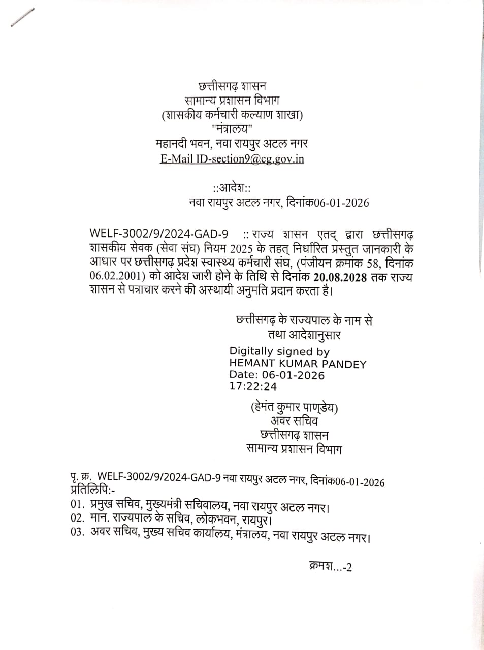 छत्तीसगढ शासन समान्य प्रशासन विभाग (शासकीय कर्मचारी कल्याण शाखा ) महानदी भवन नवा रायपुर अटल नगर दिनांक 06.01.2026 को आदेश जारी करते हुए छत्तीसगढ प्रदेश स्वास्थ्य संघ (पंजीयन क्रमांक-58 , दिनांक 06.02.2001 ) को आदेश जारी होने के तिथी से दिनांक 20.08.2028 तक राज्य शासन से पत्राचार करने की अस्थायी अनुमति प्रदान किया गया है। अनिल कुमार पाण्डेय प्रांताध्यक्ष ने बताया कि छ.ग. प्रदेश स्वास्थ्य कर्मचारी संघ, छत्तीसगढ राज्य निर्माण के बाद स्वास्थ्य विभाग का एकमात्र ऐसा संगठन रहा है जिसे लगातार शासन से पत्राचार करने हेतु मान्यता मिलता रहा है, संगठन हमेशा स्वास्थ्य कर्मचारियो के हित मे लगातार संघर्ष करते आया है और इसी संघर्ष का नतीजा है कि कई मांगे कर्मचारी हित मे पूरी हुई है।संघ को शासन से पत्राचार करने हेतु दी गई मान्यता से संघ के पदाधिकारियो एवं सदस्यो मे भारी हर्ष व्यापत है,