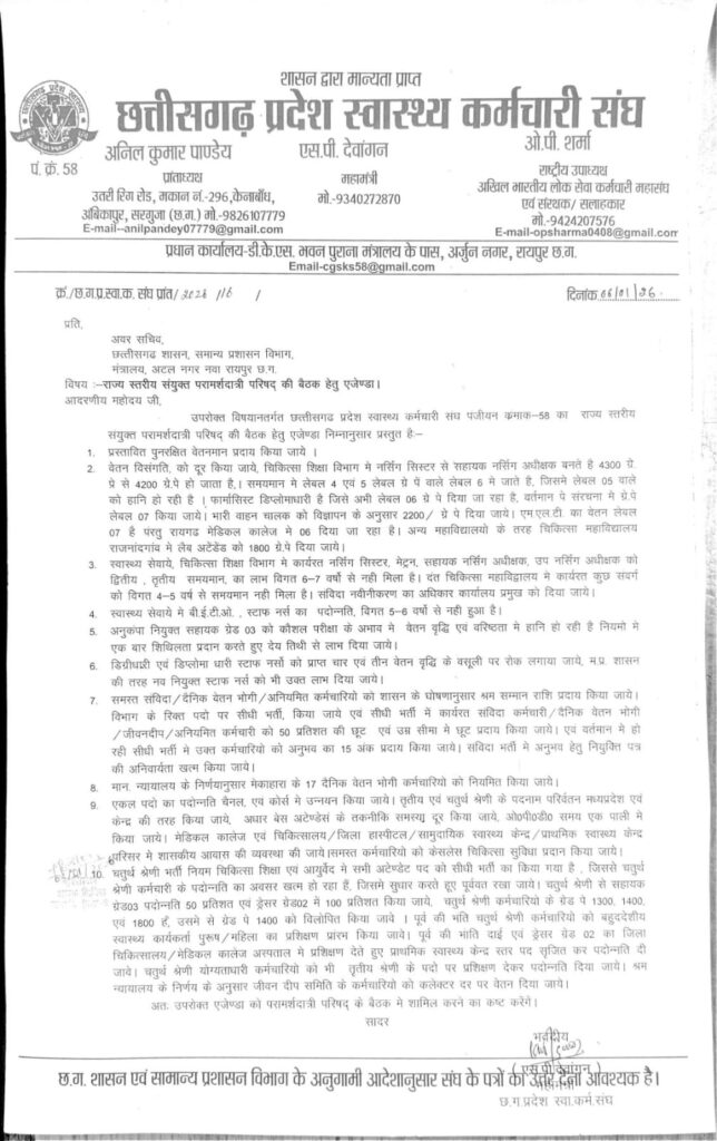 माननीय मुख्य सचिव छ.ग.शासन के अध्यक्षता मे होने वाली राज्य स्तरीय संयुक्त परामर्श दात्री परिषद् की बैठक हेतु शासन द्वारा मान्यता प्राप्त संगठनो से एजेण्डा मंगाया गया है। छ.ग. प्रदेश स्वास्थ्य कर्मचारी संघ द्वारा विभाग के कर्मचारियो के विभीन्न समस्याओ के निराकरण हेतु एजेण्डा प्रेषित किया गया है।