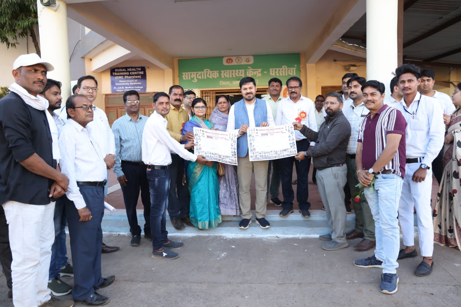 धरसीवा :- स्वास्थ्य विभाग के जीवन दीप समिति की साधारण सभा बैठक मे सामुदायिक स्वास्थ्य केंद्र धरसींवा आए पद्मश्री माननीय विधायक अनुज शर्मा जी का छत्तीसगढ़ प्रदेश स्वास्थ्य कर्मचारी संघ ब्लॉक अध्यक्ष गौतम रात्रे एवं पदाधिकारी द्वारा विधायक जी का स्वागत करते हुए नव वर्ष का बधाई दिया गया जिलाध्यक्ष सालिक नौरंगे के निर्देशन पर संघ के जिला शाखा का वार्षिक केलेण्डर विमोचन विधायक जी के करकमलों से कराया गया साथ ही संघ द्वारा साधारण सभा बैठक मे जीवन दीप समिति कर्मचारीयों का मानदेय बढ़ाने का मांग रखा गया, जिस पर माननीय विधायक अनुज शर्मा जी ने वर्तमान मानदेय मे 500/-₹ प्रतिमाह अतिरिक्त बढ़ाने का निर्णय लिया जिसके लिए संघ ने माननीय विधायक जी का धन्यवाद ज्ञापित किया इस अवसर पर माननीय विधायक अनुज शर्मा के साथ श्री दया शंकर निषाद , जनपद सदस्य श्रीमती पूजा वर्मा , जनपद अध्यक्ष श्रीमती शकुंतला सेन , श्री धीलेंद्र सेन , हुसैन खान , श्री हेमंत वर्मा, याकूब रजा , सरपंच साहिल खान एवं अन्य सभी उपस्थित रहे ।