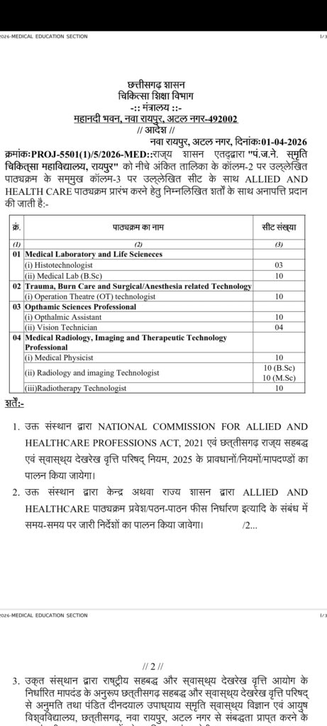 छत्तीसगढ प्रदेश स्वास्थ्य कर्मचारी संघ के मांग पर नेशनल कमीशन फार एलाईड हेल्थकेयर प्रोफेशन एक्ट 2021 एवं छत्तीसगढ राज्य सहबद्व एवं स्वास्थ्य देखरेख वृत्ति परिषद नियम 2025 के तहत् एलाईड एंड हेल्थ केयर पाठ्यक्रम प्रारंभ करने हेतु शर्तो के साथ अनापत्ति प्रदान किया गया है।