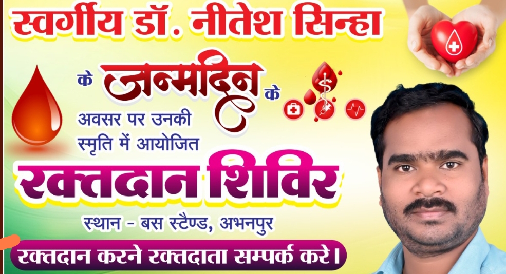 छ ग प्रदेश स्वास्थ्य कर्मचारी संघ एवं मित्र गण मंडल अभनपुर के संयुक्त तत्वाधान में स्व नितेश सिन्हा (पूर्व जिला अध्यक्ष छ ग प्रदेश स्वास्थ्य कर्मचारी संघ गरियाबंद) के जन्मदिवस स्मृति पर दिनांक 27/04/2026 को रक्तदान शिविर का आयोजन अभनपुर बस स्टैंड में किया गया है,